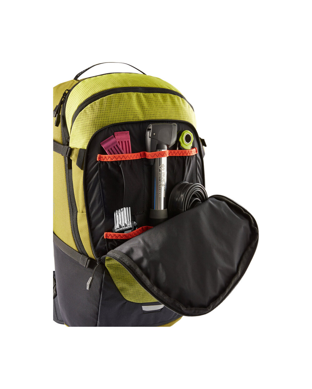 - Μπροστά από το κύριο διαμέρισμα είναι μια εσωτερική τσέπη φερμουάρ, ο χώρος εργαλείων, ο κάτοχος του κράνους, η δεξιά πτέρυγα της οσφυϊκής ζώνης, οι τσέπες των ματιών, το χωριστό διαμέρισμα ενυδατικής κρέμας, οι ιμάντες συμπίεσης στις πλευρές, το λουρί ηλίου, το αδιάβροχο σε ξεχωριστό κατώτερο διαμέρισμα και αντανακλαστικά
