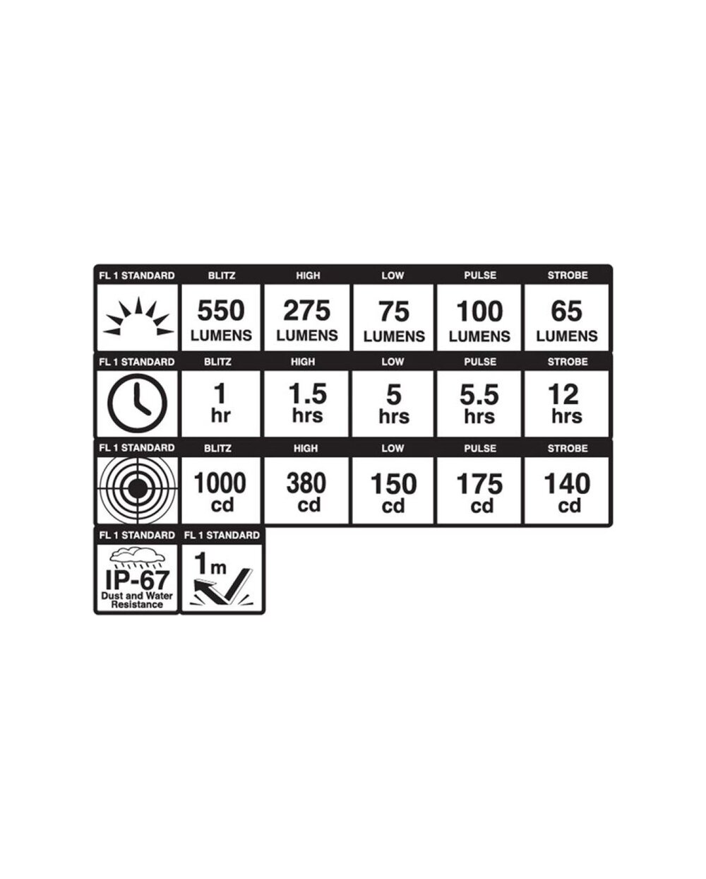 ΛΕΙΤΟΥΡΓΙΕΣ Blitz 550 lumens/1 h, High 275 lumens/1,5 h, Low 75 lumens/5,5 h, Pulse 100 lumens/5,5 h, Strobe 65 lumens/12 h
