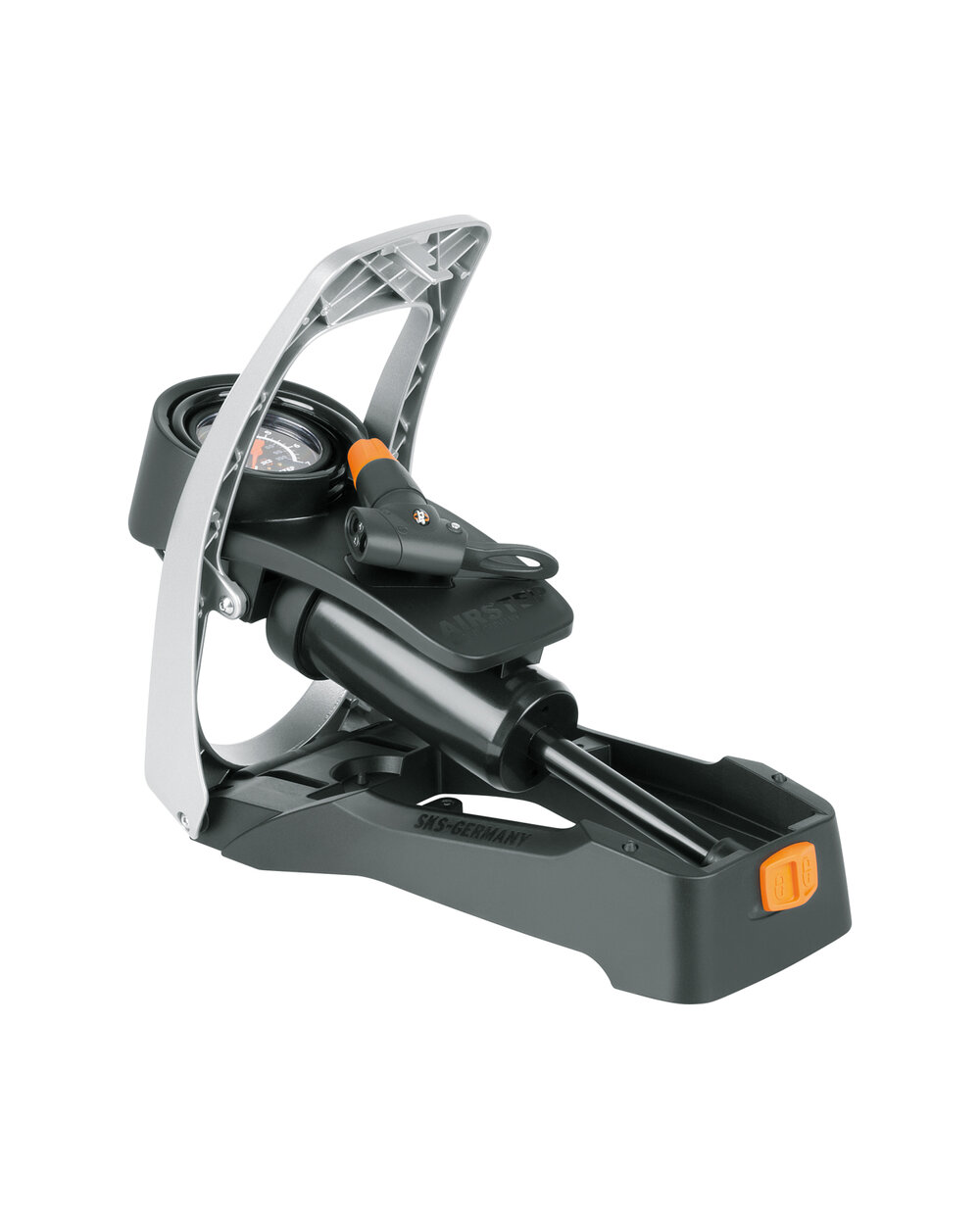 Η ποδοκίνητη αντλία SKS Germany AirStep συνδυάζει τα χαρακτηριστικά μιας κλασικής αντλίας και τις τελευταίες τεχνολογίες Made in Germany. Υλικό πρώτης κατηγορίας υψηλής ποιότητας, φιλοσοφία κατασκευής και φιλικές προς το χρήστη λειτουργίες (μεγάλο μανόμετρο, ενσωματωμένος σπειροειδής σωλήνας με κεφαλή βαλβίδας για όλους τους τύπους βαλβίδων) δίνουν στην αντλία μια εντελώς νέα και πρωτοποριακή εμφάνιση. Το εργονομικό στιβαρό πεντάλ ποδιού από αλουμίνιο επιτρέπει τη μέγιστη δυνατή πίεση 7 bar/102 PSI χωρίς δυσκολία. Το φούσκωμα δεν ήταν ποτέ τόσο εύκολο και απαλό στην πλάτη σας. Μετά το φούσκωμα, το πεντάλ πιέζεται και ασφαλίζεται με ένα κουμπί για εξοικονόμηση χώρου. Υπάρχει επίσης η δυνατότητα ανάρτησης χάρη στο προσαρτημένο στήριγμα τοίχου. Μέγ. πίεση: 7 bar/102 PSI Ενσωματωμένος εύκαμπτος σωλήνας για όλους τους τύπους βαλβίδων Δυνατότητα ανάρτησης στον τοίχο Χερούλι αλουμινίου