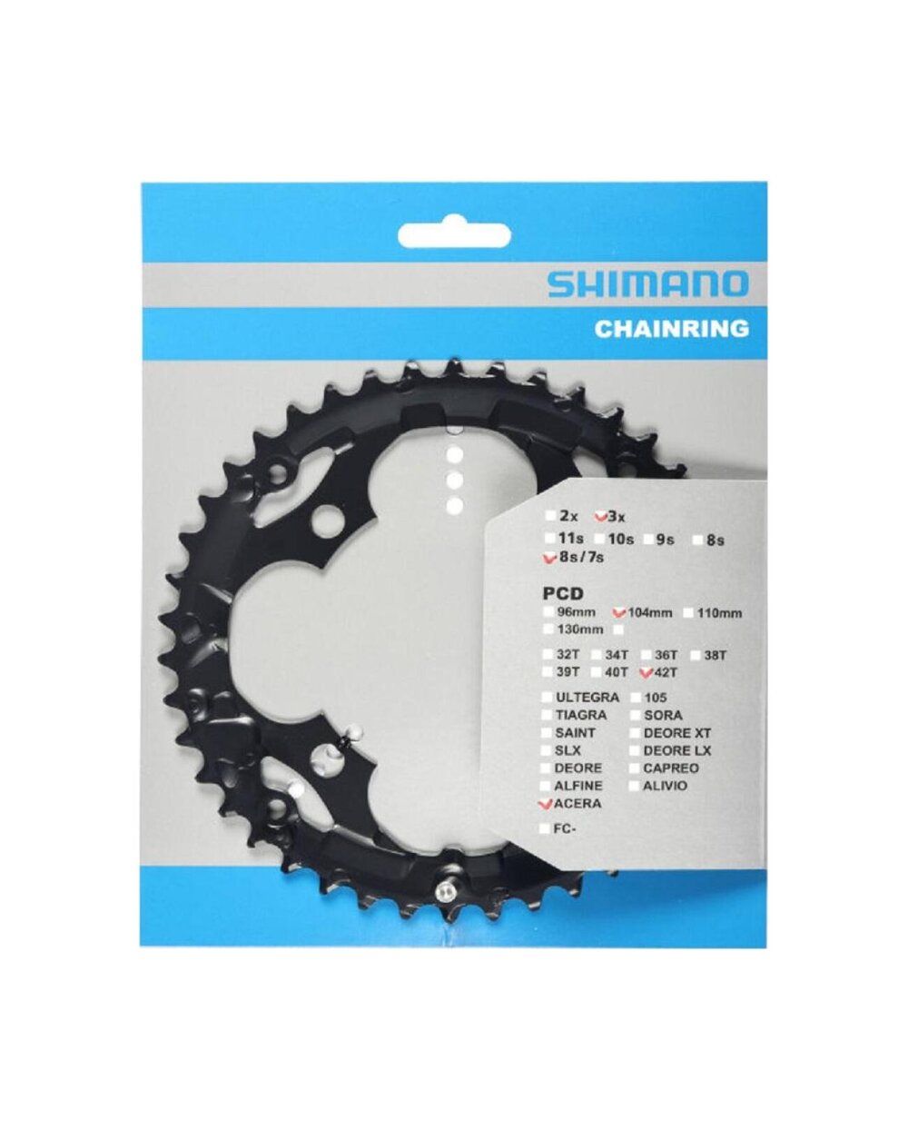 Τύπος: MTB, Συνολικό βάρος συσκευασίας: 195g, Αριθμός δοντιών στον επιλογέα: 42, επιλογείς: 7/8 ταχύτητες, Για συνδυασμούς επιλογέων: 42/32/22, Αριθμός ταχυτήτων: 3x7/8, Απόσταση ταχυτήτων: 104mm, μαύρο
