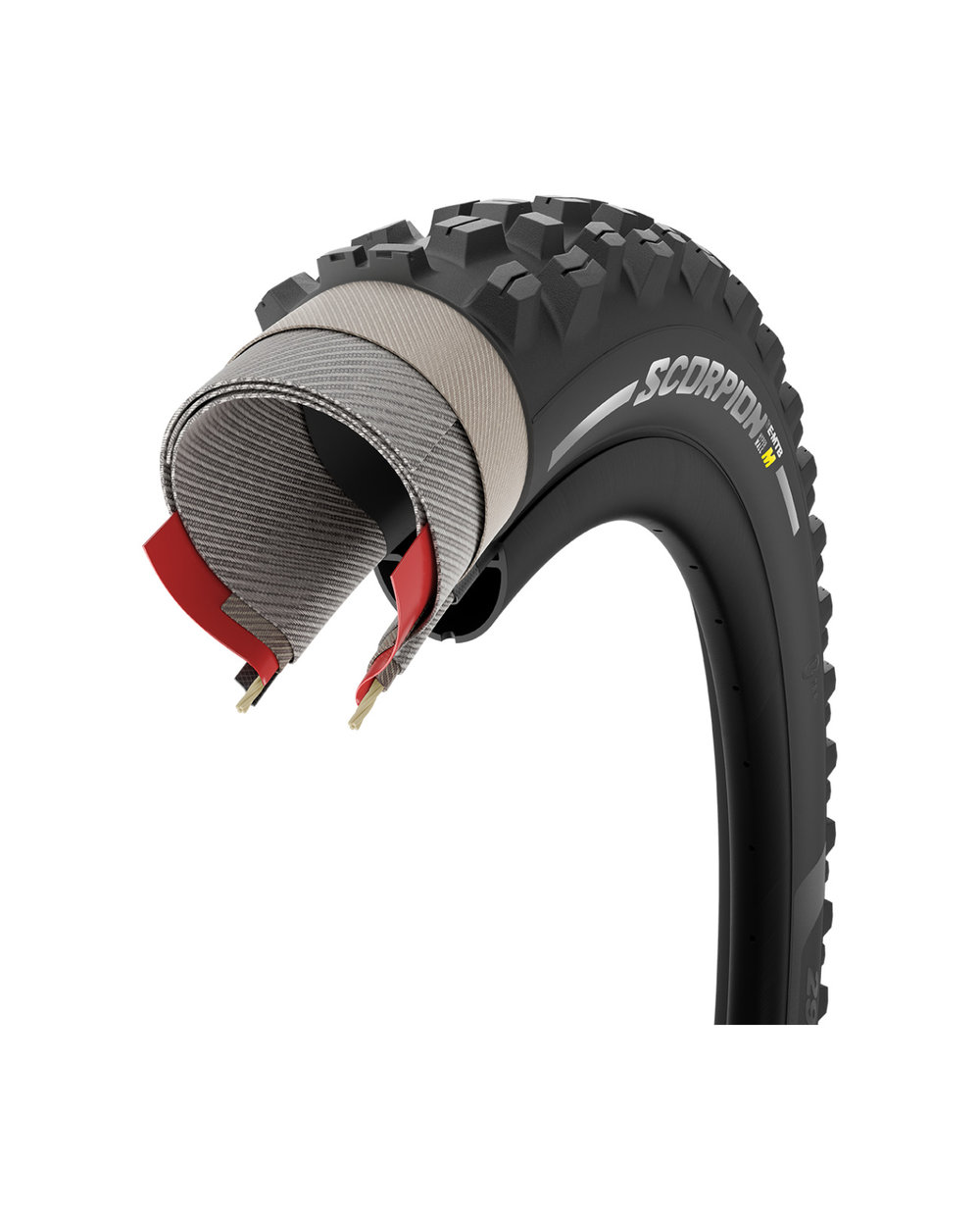 Παρουσιάζοντας τα πρώτα αποτελέσματα της εργασίας της Pirelli που πραγματοποιήθηκε υπό την επίβλεψη του θρύλου του DH Fabien Barel και σε συνεργασία με αγωνιστικές ομάδες downhill και enduro. Το Scorpion™ E-MTB είναι μια σειρά από 3 διαφορετικά σχέδια πέλματος για διαφορετικές συνθήκες εδάφους, από το M (μικτή επιφάνεια), στο R (ευέλικτο πίσω ελαστικό), στο S (μαλακή και χαλαρή επιφάνεια), που αναπτύχθηκε για να προσφέρει μια πλήρη γκάμα ελαστικών επιδόσεων για καθημερινή χρήση στα μονοπάτια. Η σειρά Scorpion™ E-MTB έχει σχεδιαστεί για ποδήλατα βουνού επιδόσεων με υποστήριξη ηλεκτροκινητήρα. Τα ελαστικά έχουν σχεδιαστεί για να αντέχουν την ισχύ των σύγχρονων ηλεκτρικών ποδηλάτων, των οποίων οι ροπές περιστροφής γίνονται όλο και μεγαλύτερες. Το Scorpion™ E-MTB παρέχει πρόσφυση και αξιοπιστία όπου χρειάζεται: η πατενταρισμένη κατασκευή HyperWALL™ επιτυγχάνει αξιοπιστία DH (downhill) χωρίς υπερβολικό βάρος, ενώ η πατενταρισμένη σύνθεση καουτσούκ SmartGRIP Gravity επιτρέπει πρόσφυση σε στεγνές και υγρές επιφάνειες, καθώς και εξαιρετική αντοχή στο σχίσιμο, χάρη σε ένα πατενταρισμένο και βιώσιμο χημικό συστατικό που ονομάζεται Lignin. Έτσι, το ελαστικό έχει επιδόσεις που διαρκούν για όλη τη διάρκεια ζωής του ελαστικού, ακόμη και μετά από μερική φθορά του μοτίβου.