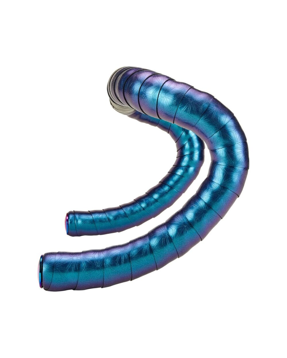 Το Supacaz Bling Handlebar Tape - Oil Slick είναι μια premium ταινία τιμονιού με χαρακτηριστικό ιριδίζον εφέ "πετρελαιοκηλίδας" που αλλάζει χρώματα ανάλογα με το φως και δίνει στο ποδήλατο μια πολύ εντυπωσιακή εμφάνιση. Είναι κατασκευασμένο από έναν συνδυασμό ενός ανώτερου στρώματος PU και ενός στρώματος αφρού/τζελ Kush Foam, το οποίο μειώνει σημαντικά τους κραδασμούς και αυξάνει την οδηγική άνεση. Τα υλικά είναι ανθεκτικά στην υπεριώδη ακτινοβολία, τον ιδρώτα και τις καιρικές συνθήκες, έτσι το περιτύλιγμα διατηρεί την εμφάνισή του ακόμη και με εντατική χρήση. Το περιτύλιγμα έχει μήκος περίπου 2160 mm, πλάτος 30 mm και πάχος περίπου 3 mm, το οποίο παρέχει ευχάριστο κράτημα ακόμα και σε μεγάλα ταξίδια. Η συσκευασία περιλαμβάνει δύο ρολά περιτυλίγματος, καπάκια αλουμινίου Star Plugz και ταινία φινιρίσματος για καθαρό και σφιχτό φινίρισμα. Σχεδιασμένο για να συνδυάζει το έντονο στυλ με τη λειτουργικότητα, την καλή αντικραδασμική προστασία και την ανθεκτικότητα, αυτό το μοντέλο είναι δημοφιλές στους αναβάτες που θέλουν να συνδυάσουν άνεση και οπτικό αντίκτυπο.