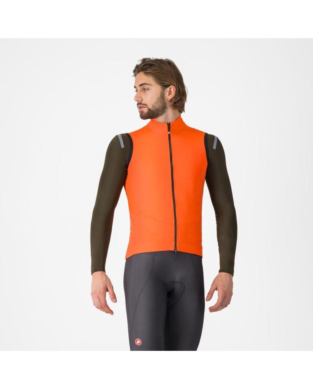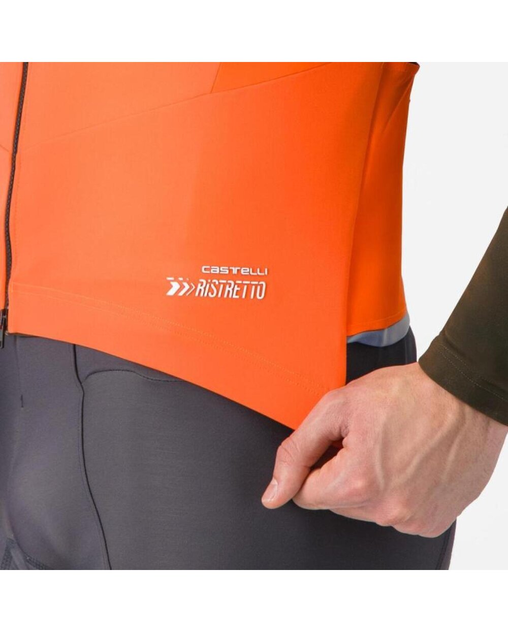 Αυτό το γιλέκο είναι φτιαγμένο για όταν πρέπει να είστε ζεστοί καθ' όλη τη διάρκεια της διαδρομής. Είναι το πιο ζεστό μας γιλέκο, αλλά χάρη στην εξαιρετική του αναπνοή καλύπτει ένα ευρύ φάσμα θερμοκρασιών. Η τεχνολογία υλικού Castelli Ristretto το κάνει τόσο ευέλικτο. Το υλικό είναι σχεδιασμένο με δυνατότητα αναπνοής, επομένως είναι αντιανεμικό, αλλά αφήνει πολύ λίγο αέρα, κάτι που βοηθά να απομακρύνει περισσότερο ιδρώτα και να σας κρατά στεγνούς. Το μπροστινό μέρος είναι κατασκευασμένο από μια μεσαίου βάρους έκδοση του υλικού Ristretto, ενώ το πίσω μέρος είναι κατασκευασμένο από ελαστικό ύφασμα για ακόμα μεγαλύτερη διαπνοή. Θα παραμείνετε στεγνοί, πράγμα που σημαίνει ότι μπορείτε να ζεσταθείτε ακόμα και με ένα πιο λεπτό γιλέκο. Μπορείτε να ρυθμίσετε τον αερισμό με το διπλό φερμουάρ YKK® Vislon®. Τρεις ευρύχωρες πίσω τσέπες μπορούν να χωρέσουν τον εξοπλισμό σας. Ο γιακάς είναι αρκετά ψηλός ώστε να μπορείτε να αφήσετε το μαντήλι στο σπίτι