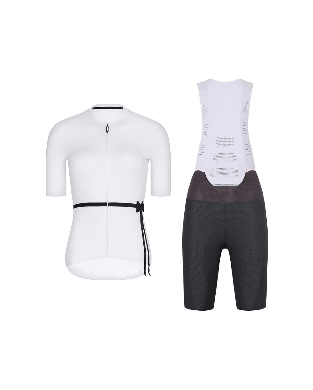 Το γυναικείο σετ ποδηλασίας Rivanelle συνδυάζει την κομψή μπλούζα LOVELY σε λευκό χρώμα και το υψηλών επιδόσεων σορτς με τιράντες NOVEL PRO σε ανθρακί χρώμα, δημιουργώντας ένα απόλυτα συντονισμένο σύνολο για προπόνηση αλλά και για μεγάλες βόλτες. Η φανέλα ξεχωρίζει με το κομψό και ελαφρώς ρομαντικό της σχέδιο με φιόγκο στο πλάι και μακριές κορδέλες, ενώ το ελαφρύ και αναπνεύσιμο υλικό είναι πολύ ευχάριστο στο σώμα, προσαρμόζεται άριστα στη σιλουέτα και εξασφαλίζει άνεση καθ' όλη τη διάρκεια της ποδηλασίας. Πρακτικές λεπτομέρειες όπως το φερμουάρ που κλείνει σε όλο το μήκος με προστασία για το λαιμό, η τριπλή πίσω τσέπη με τσέπη ασφαλείας με φερμουάρ και το χωρίς ραφές στρίφωμα με αντιολισθητική εκτύπωση αυξάνουν τη λειτουργικότητα της φανέλας.