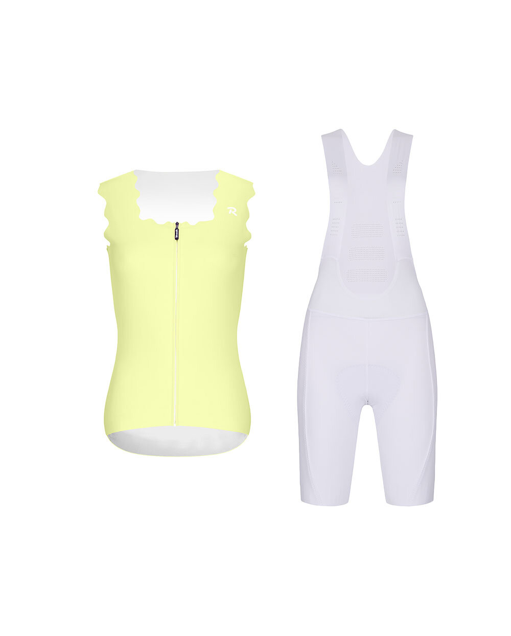 Το γυναικείο σετ ποδηλασίας Rivanelle SCALLESSA & NOVEL PRO αποτελεί τον ιδανικό συνδυασμό στυλ, άνεσης και απόδοσης για τις ποδηλάτισσες που θέλουν να έχουν υπέροχη εμφάνιση στο ποδήλατο και ταυτόχρονα να αισθάνονται απόλυτη άνεση. Το σετ συνδυάζει την πρωτότυπη αμάνικη φανέλα SCALLESSA σε κίτρινο χρώμα με μοναδική κυματιστή επένδυση και το κοντό ποδηλατικό παντελόνι με τιράντες NOVEL PRO σε λευκό χρώμα, σχεδιασμένο για απαιτητικές προπονήσεις και πολλές ώρες στη σέλα.