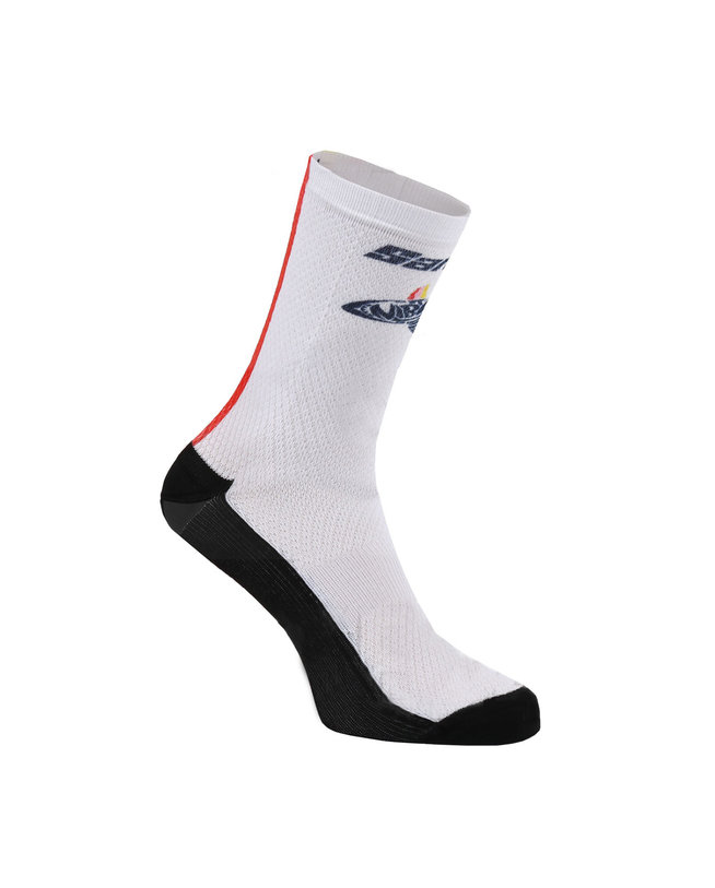 Ελαφριές καλοκαιρινές κάλτσες ποδηλασίας με σχέδιο VINCEZO NIBALI. Σχεδιασμένες για να διατηρούν τα πόδια σας δροσερά ακόμα και όταν κάνετε ποδήλατο με τον πιο ζεστό καιρό. Οι τρεις ρίγες - ροζ, κίτρινη και κόκκινη - συμβολίζουν τις νίκες του Nibali και στους τρεις μεγάλους γύρους. Κατασκευάζεται στην Ιταλία.